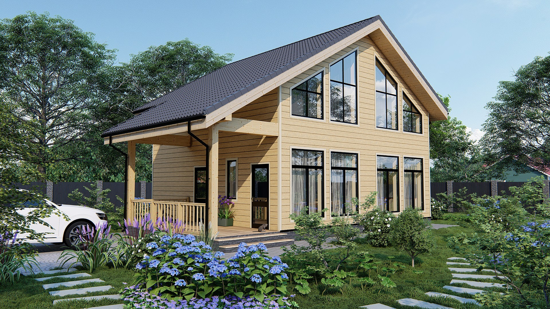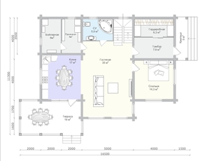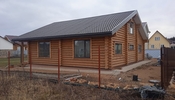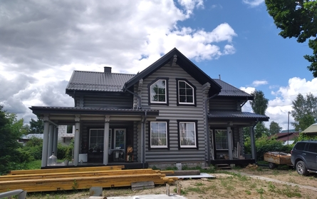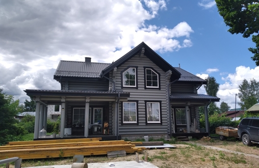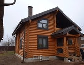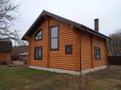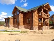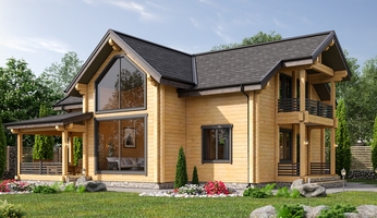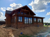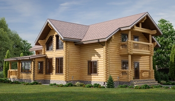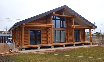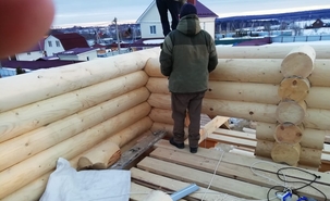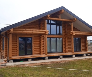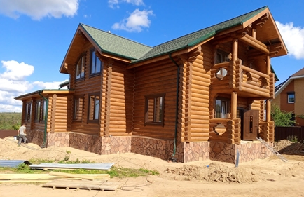 Стены могут быть возведены из клееного бруса или оцилиндрованного бревна. Фундамент обязательно покрывается гидроизоляцией, а затем выполняется обвязка доской из лиственницы. При строительстве из бревна или бруса используется межвенцовый утеплитель «Политерм», который обеспечивает естественную циркуляцию воздуха, не слеживается со временем, хорошо сжимается и не гниёт. Его следует укладывать в чашах, угловых соединениях и пазах. Для скрепления венцов применяются «пружинные узлы» в сочетании с нагелями. Важно точно соблюдать технологию монтажа, оставляя зазор над шляпкой пружинного узла или нагелем, чтобы следующий элемент не препятствовал плотному прилеганию бруса или бревна. Само собой, каждый брус или бревно проверяется уровнем.